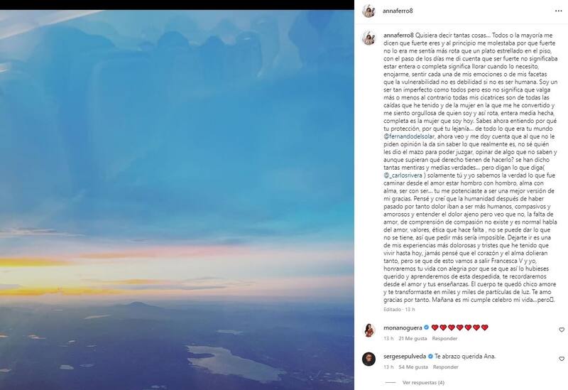 "Dejarte ir es una de mis experiencias más dolorosas y tristes que he tenido que vivir hasta hoy, jamás pensé que el corazón y el alma dolieran tanto, pero se que de esto vamos a salir Francesca V y yo, honraremos tu vida con alegría porque sé que así lo hubieses querido y aprenderemos de esta despedida, te recordaremos desde el amor y tus enseñanzas", concluyó.