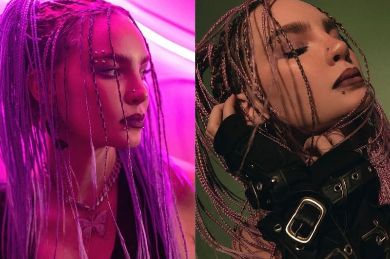 La actriz de "Bienvenidos a Edén" se ha mostrado con un cabello trenzado de color rosa, magas de piel, piercings en la parte superior de los ojos, collar de mariposa y uñas largas, combinada de color rojo y negro. El año pasado la cantante se disfrazó como la novia de Frankenstein.