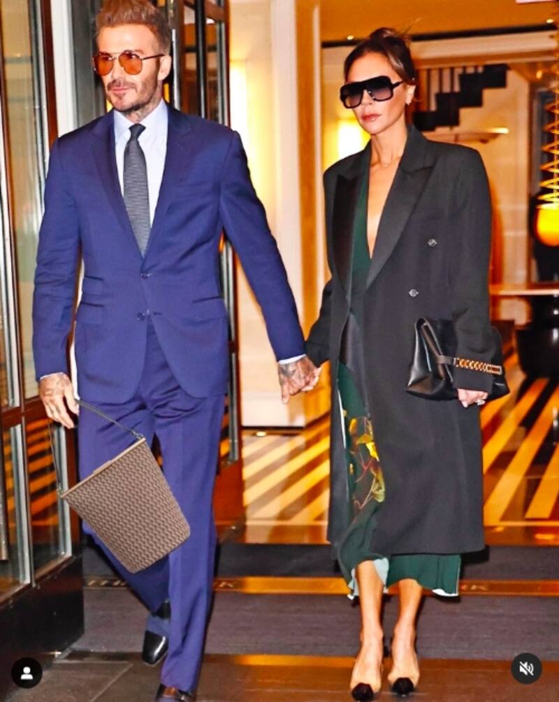 Por su parte, David Beckham lució elegante con un traje azul, camisa blanca, corbata gris y zapatos a juego, complementó con lentes marrones y el bolso puesto en edición que se movía de un lado para el otro.