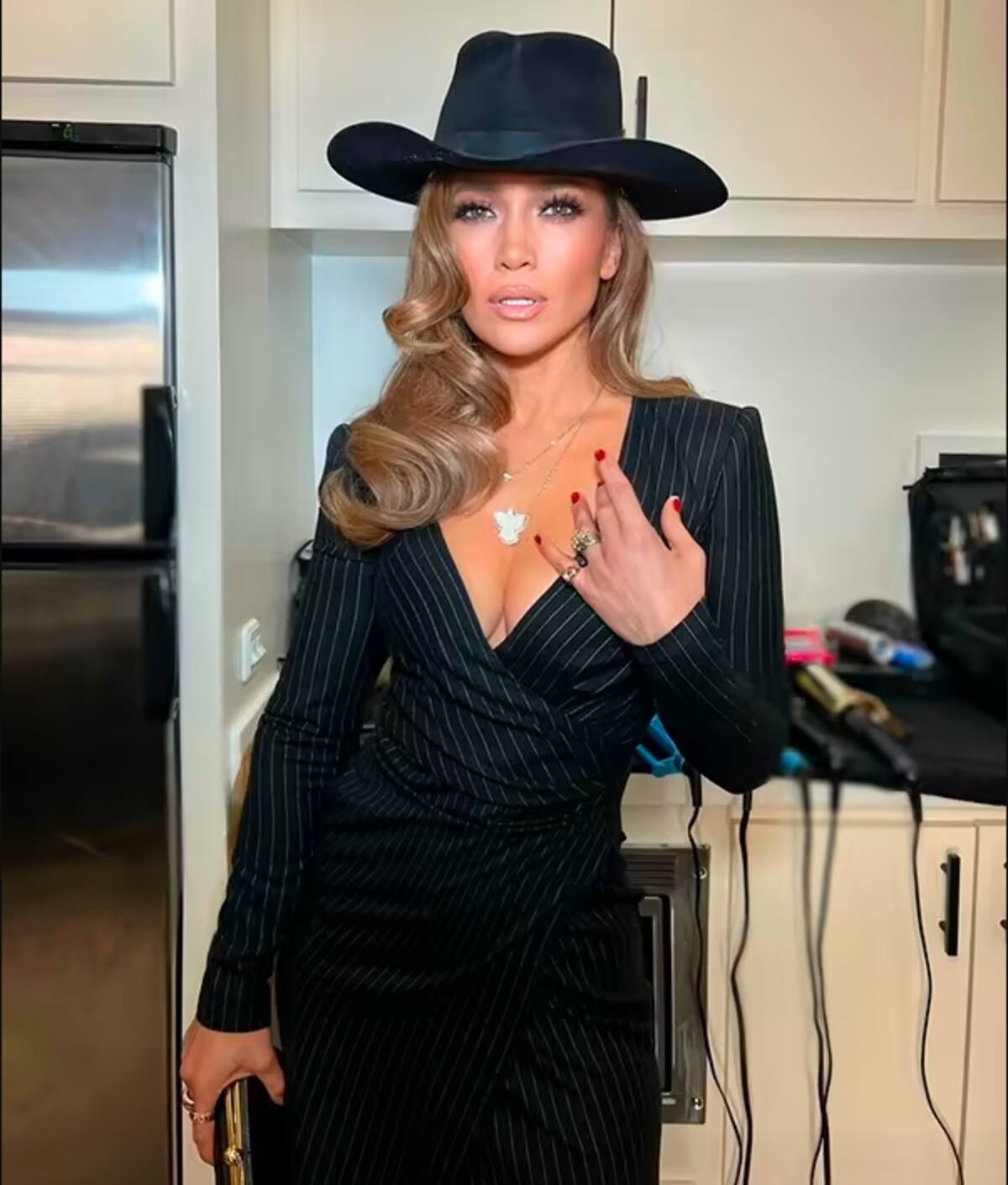 Su elección fue un vestido negro a rayas muy escotado como varias veces la vemos luciendo sus atributos. La cantante, actriz y empresaria agregó algunos accesorios que le dieron un estilo mucho más interesante. Tacones negros Christian Louboutin que son conocidos por ser bastante incómodos pero ella los manejó como toda una experta, un gran collar con dije blanco y la pieza statement fue un sombrero vaquero en tono obscuro complementando su peinado con ondas muy abiertas.