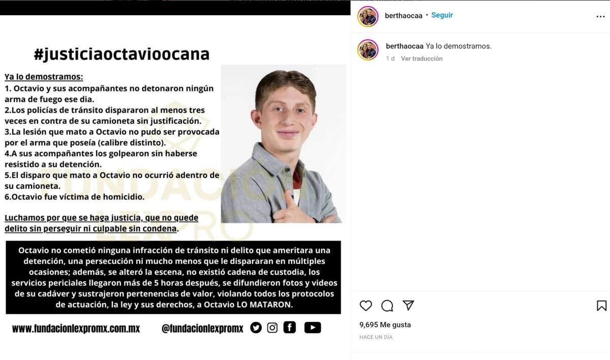 Bertha Ocaña dio nueva información en el caso y aseguró que no dejarán a los presuntos culpables sin condena. "Octavio no cometió ninguna infracción de tránsito", escribió en sus publicaciones de Instagram.