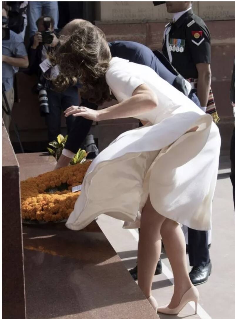 Se dice que la falda de Kate se levantó mientras practicaba un deporte popular en Bután, el tiro con arco. Este error de moda generó comparaciones con ocasiones anteriores, como cuando del príncipe William y Kate Middleton visitaron Nueva Delhi en 2016.Durante un servicio de ofrenda floral, una ráfaga de viento voló el vestido de la princesa de Gales .La duquesa llevaba un vestido color crema de Emilia Wickstead con una falda vaporosa.