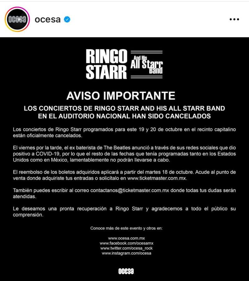 Posteriormente, Ocesa, la empresa promotora, informó por medio de un comunicado que subió a sus redes sociales que los conciertos quedan cancelados y no se reagendaran, así que las personas que compraron boletos de las presentaciones de Ringo Starr podrán tener un rembolso a partir de este 18 de octubre en el lugar donde adquirieron sus entradas y en Ticketmaster.