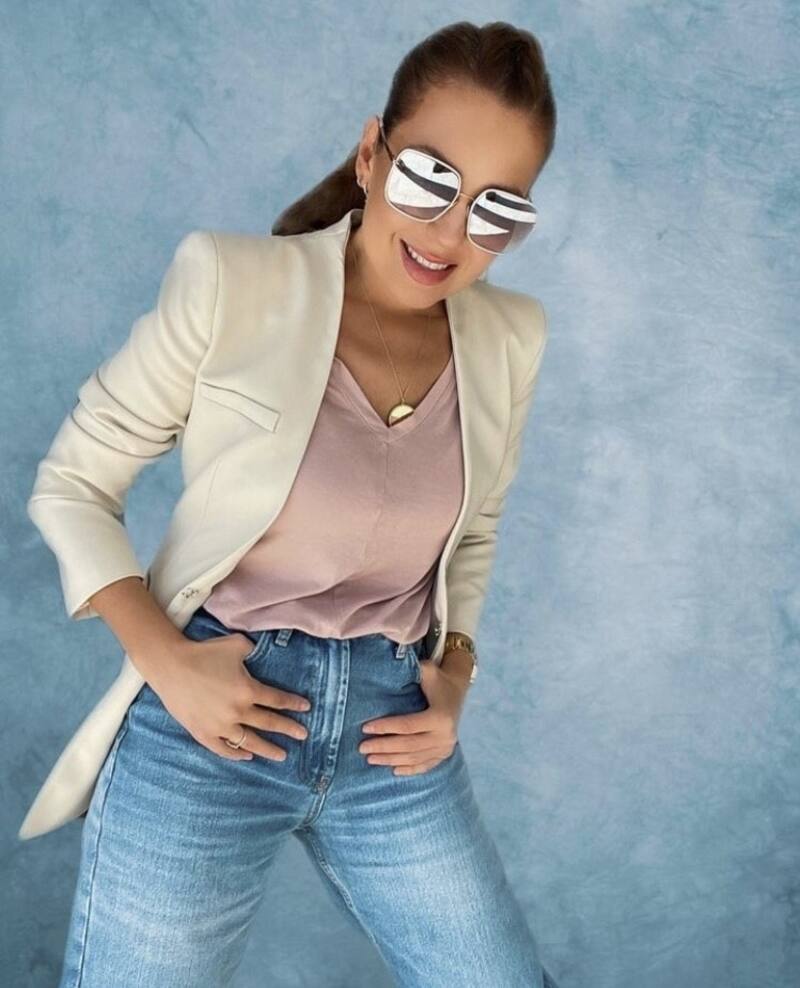 Ahora, la cantante mexicana a través de su cuenta de Instagram compartió una fotografía en la que mostraba un atuendo ideal para ir a la oficina o asistir a una reunión. En esta ocasión eligió un pantalón de mezclilla acampanado que combino con una camiseta rosa y un blazer blanco.