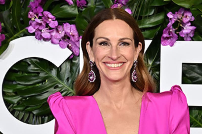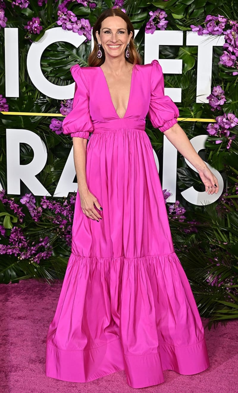 El vestido rosa fuerte de manga tres cuartos de Julia Roberts presentaba hombros exagerados y un cuello en V muy escotado. El vestido estaba ceñido en la cintura y fluía en una falda con volantes, que hacían lucir bellísima a la actriz.