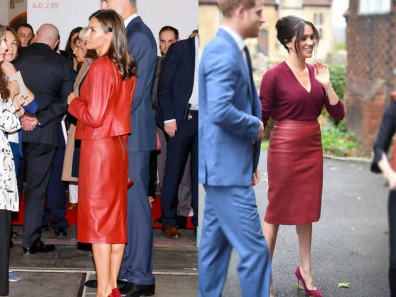 La primera vez que Letizia lució su falda de cuero roja fue en Seúl durante su Viaje de Estado a Corea el 24 de octubre de 2019, varios días después de participar en los festejos con motivo de la entronización de Naruhito de Japón. No habían pasado ni 24 horas, cuando Meghan Markle apareció con la misma prenda en una mesa redonda sobre igualdad de género con The Queen's Commonwealth Trust (QCT) y One Young World en el Castillo de Windsor.