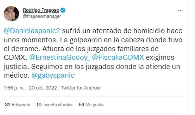 Tras el incidente, Daniela Spanic interpuso una denuncia por los hechos, esperando detengan al responsable, así lo dio a conocer su mánager Rodrigo Fragoso, a través de su cuenta de Twitter.