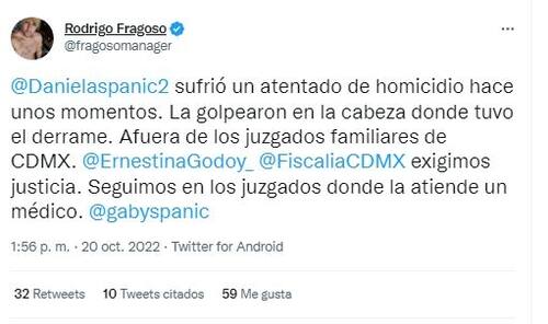 Tras el incidente, Daniela Spanic interpuso una denuncia por los hechos, esperando detengan al responsable, así lo dio a conocer su mánager Rodrigo Fragoso, a través de su cuenta de Twitter.