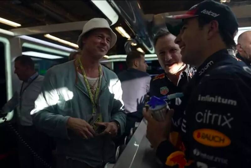 "Esa fue una buena respuesta", contestó Sergio "Checo" Pérez entre risas y Brad Pitt tuvo que seguir su recorrido donde también se acercó a otros corredores.