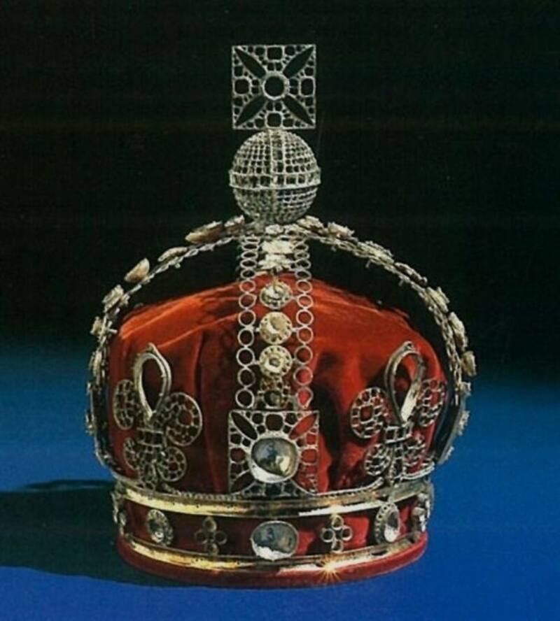 La corona (1821) era de los tocados favoritos de la reina Isabel, de hecho, lo utilizó en el camino a su coronación y en cada apertura estatal del parlamento. La diadema estatal está engastada con mil 333 diamantes en plata y oro.