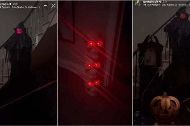 Asimismo, Georgina Rodríguez compartió una foto en la que aparecen Eva, Mateo y Alana en la puerta principal de su casa, que también está decorada con un enorme fantasma blanco que contrasta con el negro de la puerta, flanqueada por los dos lados por toda clase de objetos como velas, calabazas, hojas, esqueletos, lápidas e incluso algún que otro ataúd.