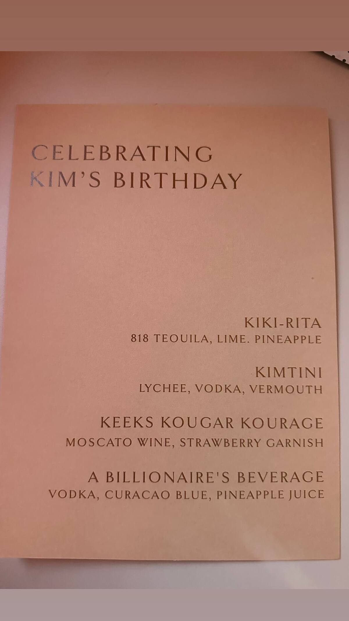 Entre las sorpresas con las que contó la celebración estuvo un especial detalle de Kylie Jenner para su hermana. La modelo creó cinco tragos especiales para la ocasión, todos en honor a Kim Kardashian.