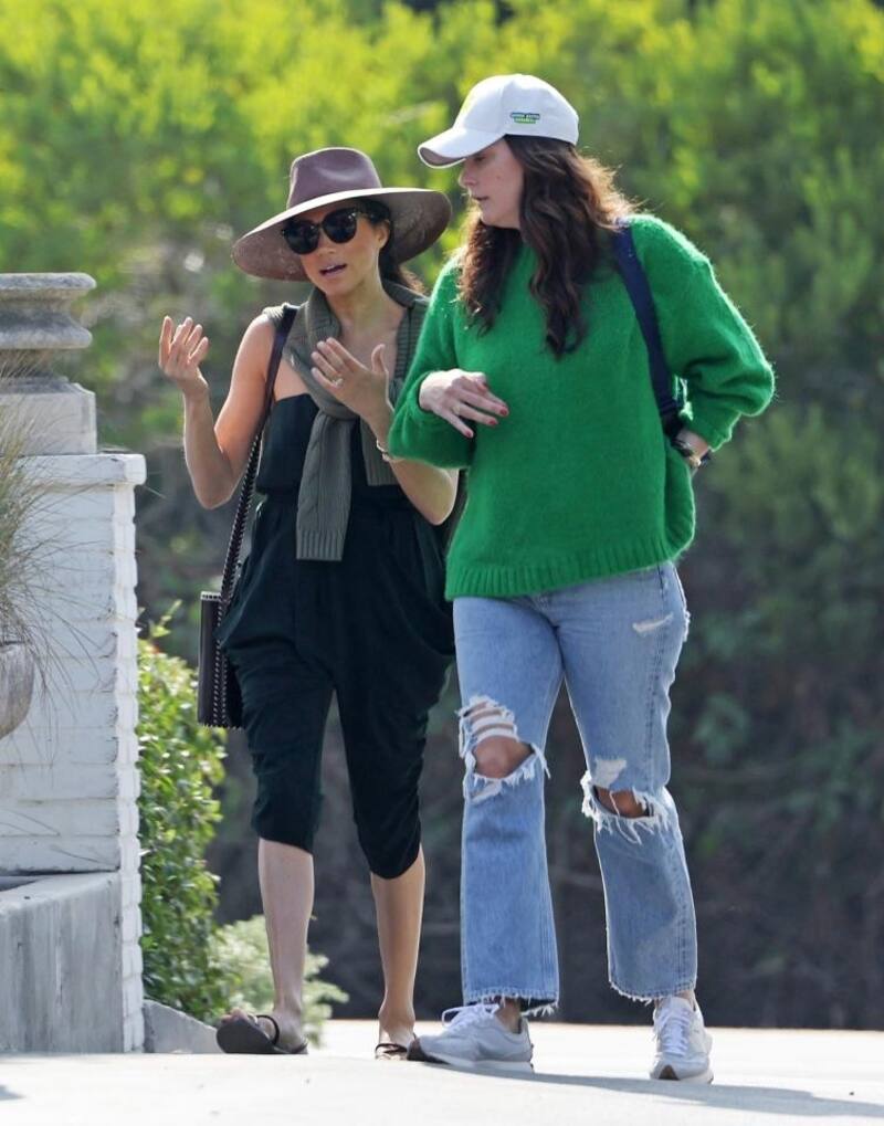 La duquesa de Sussex usó un mono verde sin tirantes de Malia Mills de 595 dólares, que combinó con un suéter verde olivo, un sombrero de Cuyana de 128 dólares, lentes de sol y sandalias. Ese look relajado lo completó con una trenza despeinada.