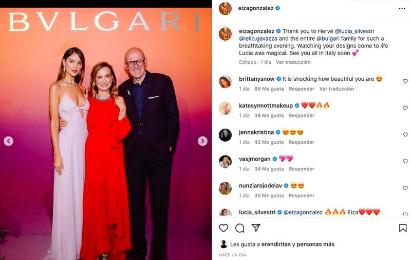 En el primero de los posteos, con fotos en las que lució la joyería, Eiza escribió: "hermosa noche con Bulgari".