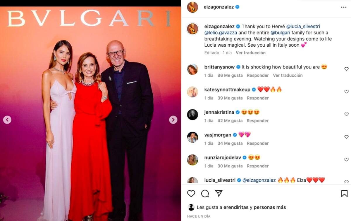 En el primero de los posteos, con fotos en las que lució la joyería, Eiza escribió: "hermosa noche con Bulgari".