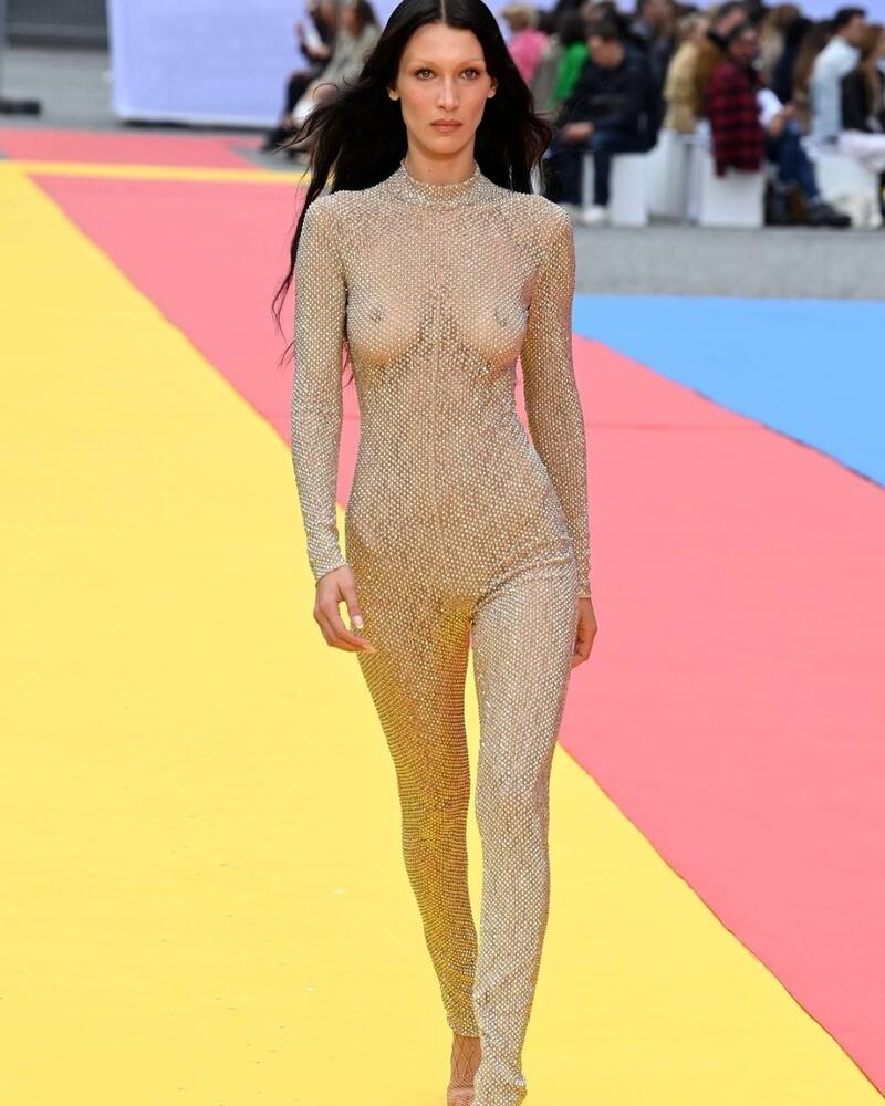 Bella causó sensación al cierre del desfile de Coperni, cuando apareció en ropa interior y tacones y en la pasarela le pintaron el vestido diseñado por Sébastien Meyer y Arnaud Vaillant con un espray especial que luego se solidificó.