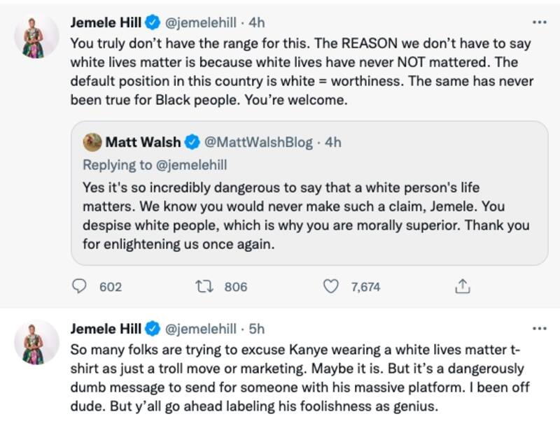 Añadió: "En su intención, es una noción supremacista blanca, porque postula que no podemos tener una conversación sobre el valor de los negros sin tener una conversación sobre el valor de los blancos, lo cual es una locura. La noción de que SIEMPRE tiene que ser sobre personas blancas en Estados Unidos es increíblemente frustrante, emocionalmente agotadora y todo el problema. Pero aquí está Kanye, aparentemente centrando esa noción".