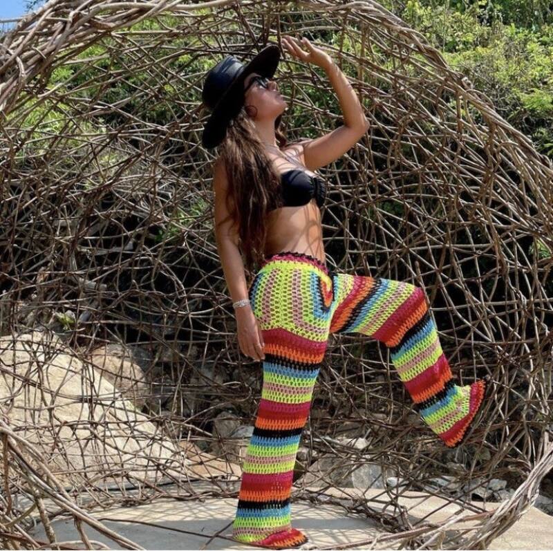 Mientras que el segundo look de playa, la tapatía deslumbró con un bikini strapless en color negro y lo combino con un pantalón de playa multicolor, al que le puso como accesorios un sombrero negro y gafas.