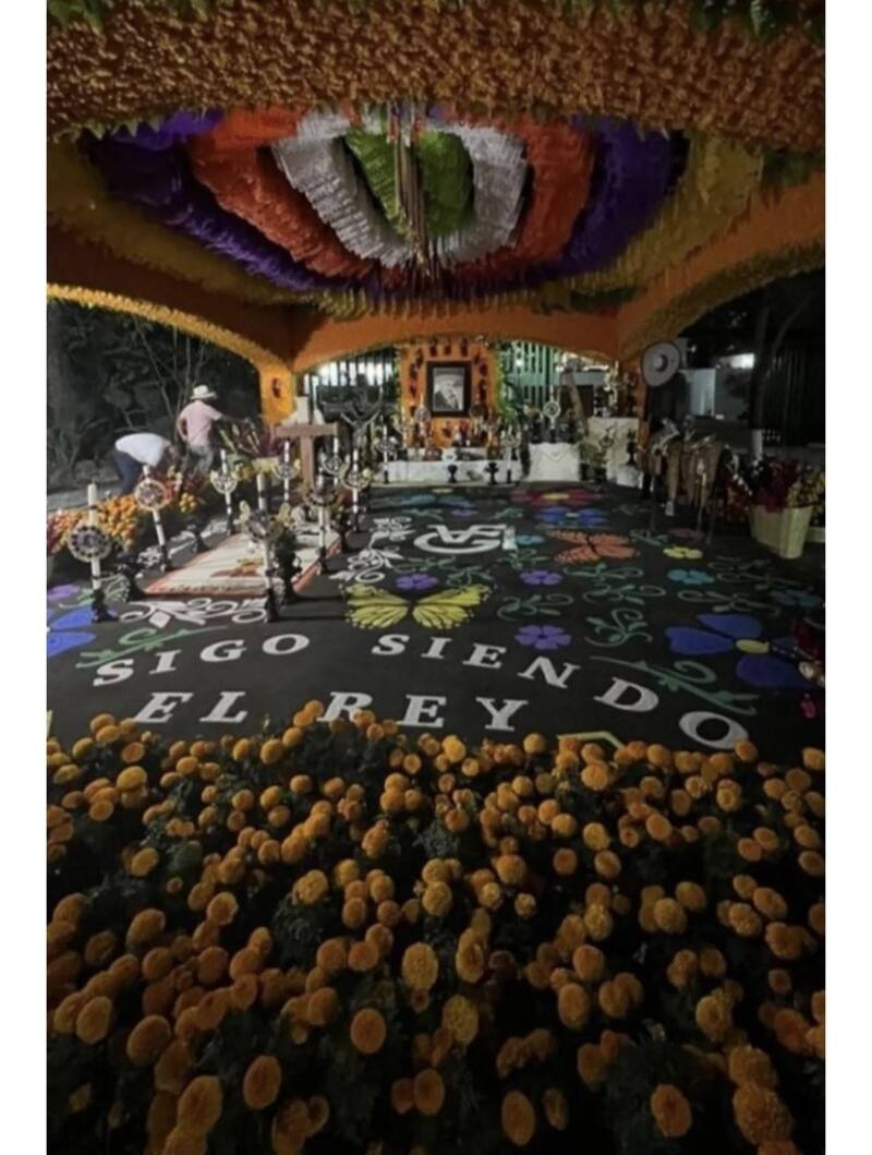 La ofrenda fue montada enfrente de la tumba del cantante y en esta destaca la leyenda “Sigo siendo el rey”, así como un tapiz negro con estampado de flores y mariposas. Además de que no puede faltar los cirios que alumbran la llegada de las almas y las flores de cempasúchil que dan el colorido a toda ofrenda.