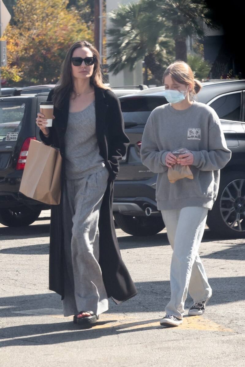Angelina Jolie tenía el pelo largo suelto y gafas de sol mientras sostenía un café y una bolsa marrón. Vivienne Jolie- Pitt tenía el cabello recogido hacia atrás en una cola de caballo baja y usaba un cubrebocas azul claro para mantenerse segura. También usaba una bolsa marrón similar a la de su mamá .
