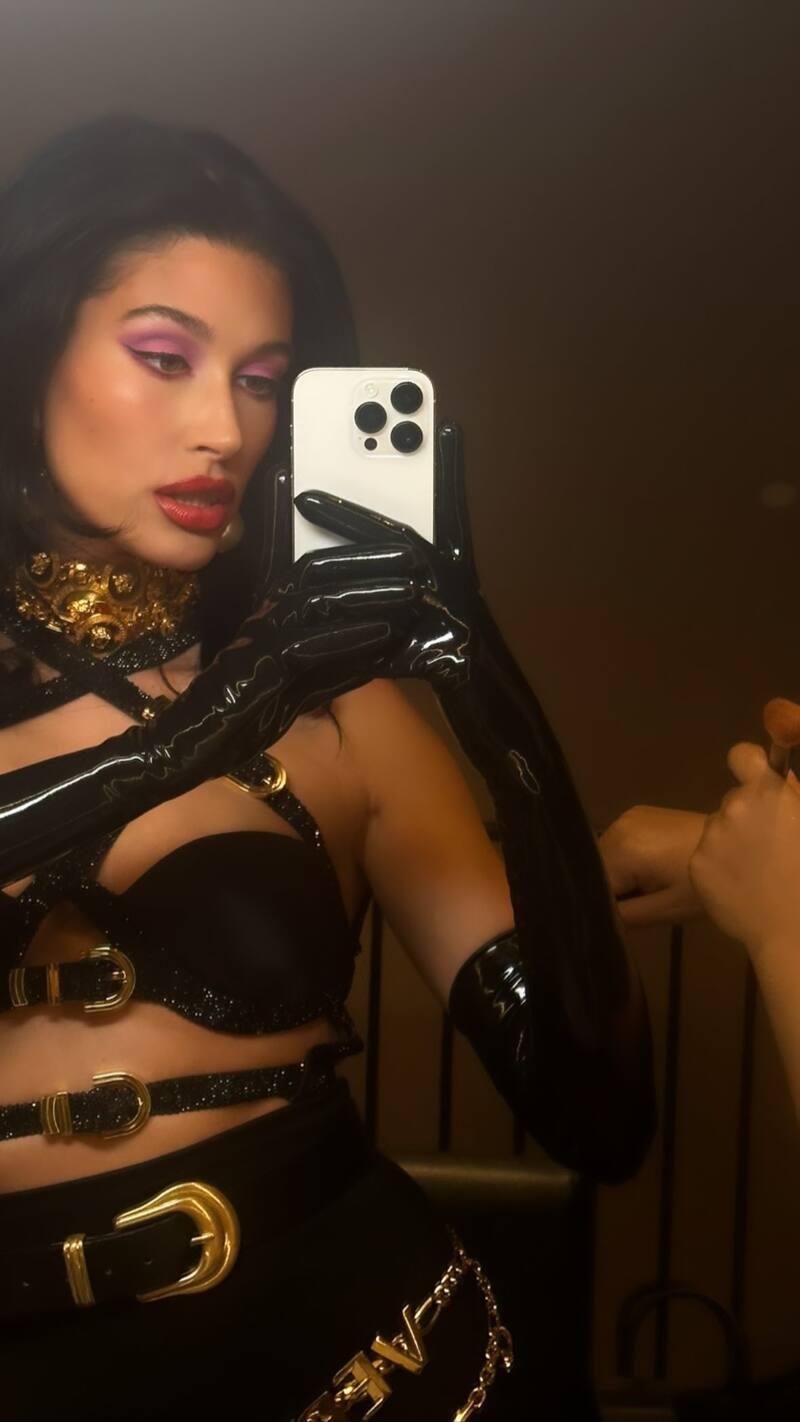 La esposa de Justin Bieber se veía espectacular en un sostén de arnés negro con correas entrecruzadas, que combinó con una minifalda corta que dejó sus piernas tonificadas a la vista y envolvió un cinturón negro alrededor de su cintura para ceñirla.