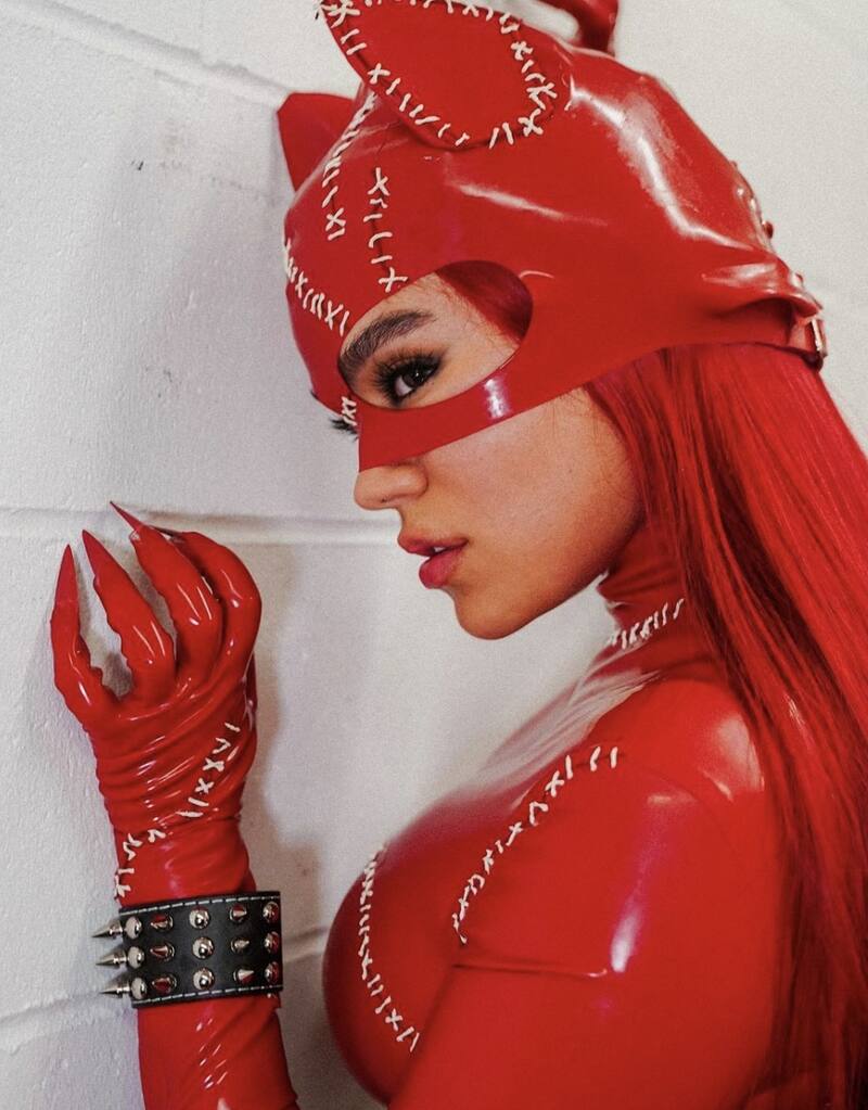 Con el lanzamiento reciente de "Gatúbela", Karol G optó por este disfraz, pero de color rojo intenso, al igual que su cabello. En la publicación escribió: "Ya estoy elevá!", mensaje y fotografía con la que la artista paisa sacó más de un suspiro.