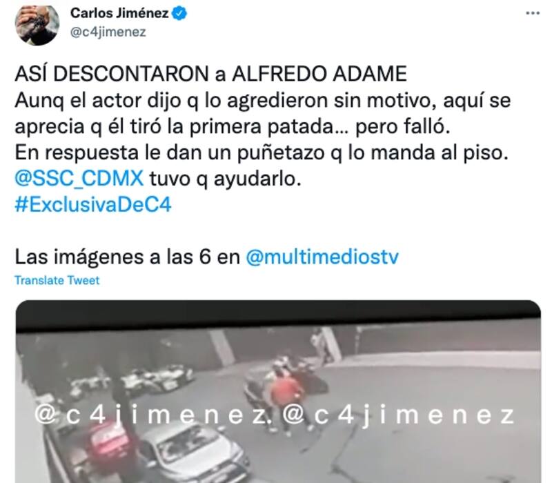 "ASÍ DESCONTARON a ALFREDO ADAME", tituló a la publicación en su cuenta de Twitter. Explicó: "Aunq el actor dijo q lo agredieron sin motivo, aquí se aprecia q él tiró la primera patada… pero falló. En respuesta le dan un puñetazo q lo manda al piso. @SSC_CDMX tuvo q ayudarlo. #ExclusivaDeC4".