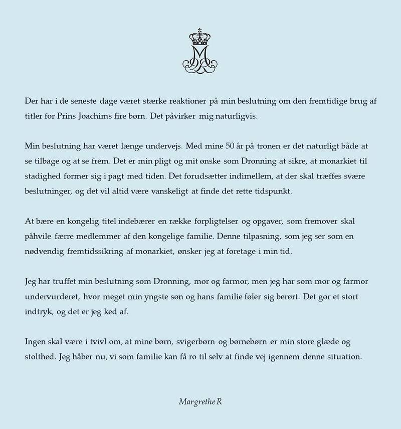 En un comunicado, la monarca planteó que "en los últimos días, ha habido fuertes reacciones a mi decisión sobre el uso futuro de títulos para los cuatro hijos del príncipe Joachim" y que "obviamente me afecta".