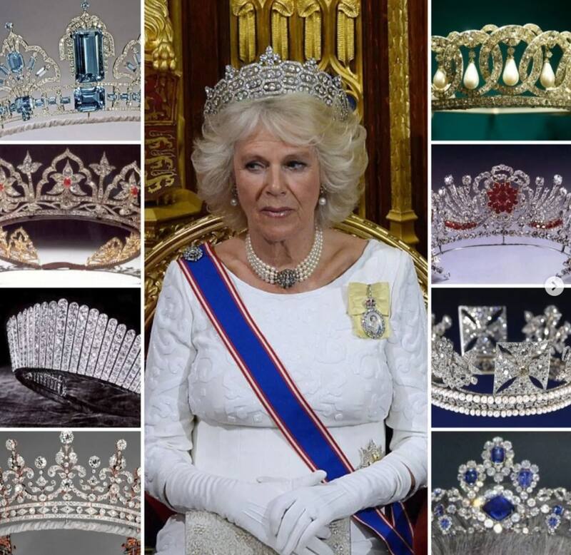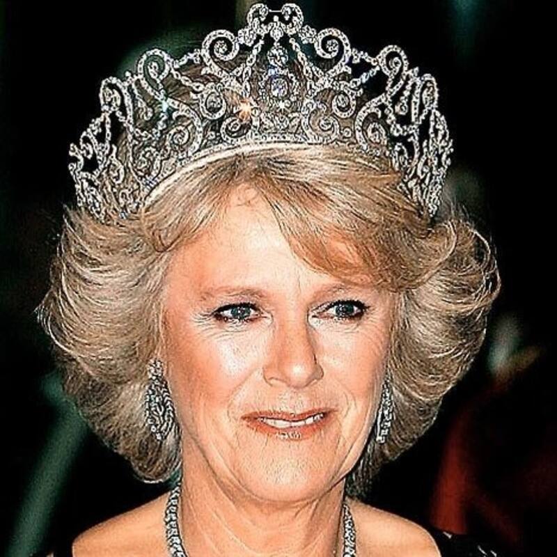 En vida, la reina Isabel le dio un par de tiaras a Camilla para que las luciera en las noches de gala que eran requeridas. Una de ellas es la tiara Delhi Durbar, hecha para la reina María en 1911 y que solía usar la reina madre. Camilla solo la ha usado en una ocasión y fue durante una cena de Estado en Noruega en 2005.