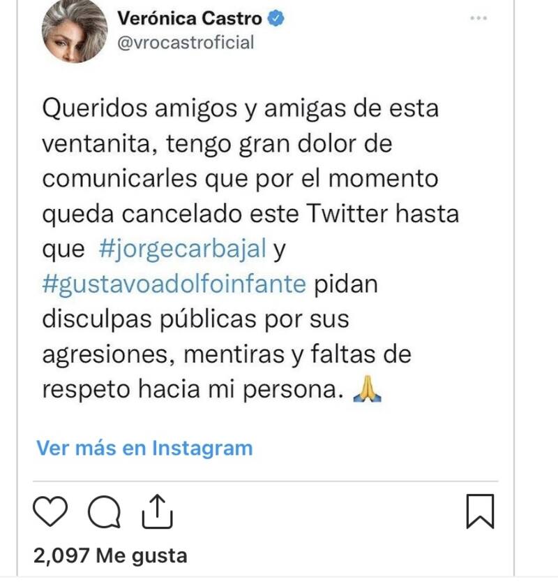 “Queridos amigos y amigas de esta ventanita, tengo gran dolor de comunicar que por el momento queda cancelado mi Twitter hasta que #jorgecarbajal y #gustavoadolfoinfante pidan disculpas públicas por sus agresiones, mentiras y fastas de respeto hacia mi persona”, escribió la actriz con una imagen de un par de manos en posición de plegaria.