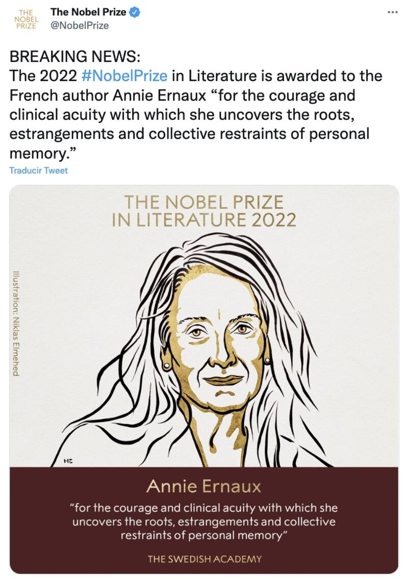 La Academia Sueca reveló el nombre de la ganadora del anhelado Premio Nobel de Literatura de este año, otorgado a la francesa Annie Ernaux. Con 82 años y nacida en Lillebonne, la escritora, catedrática y profesora de letras modernas, recibió el galardón más deseado en el mundo de la escritura.