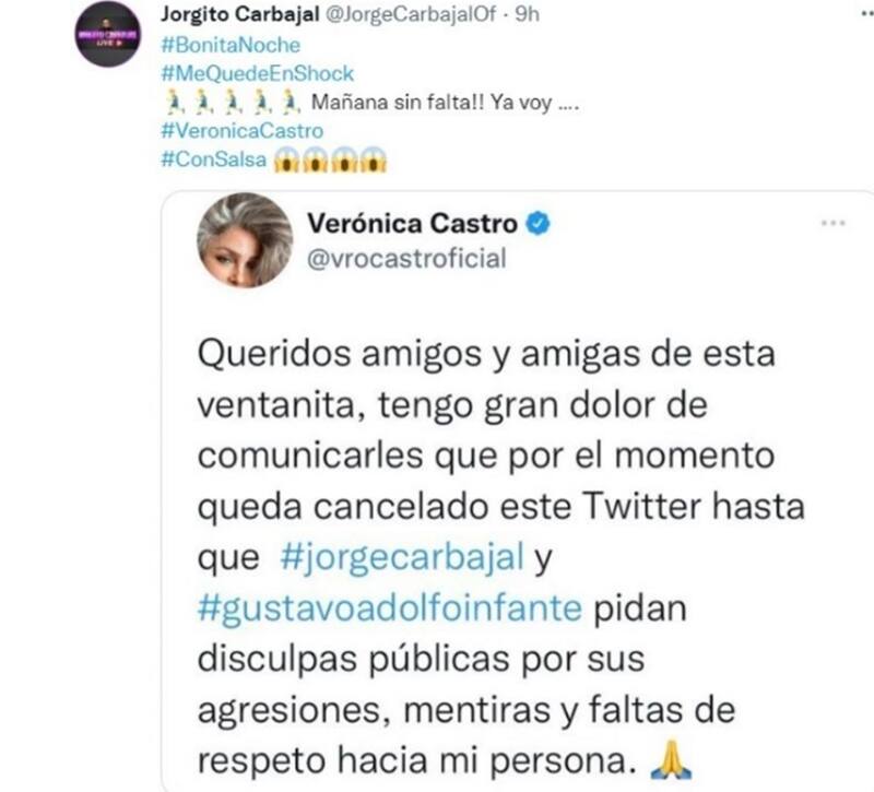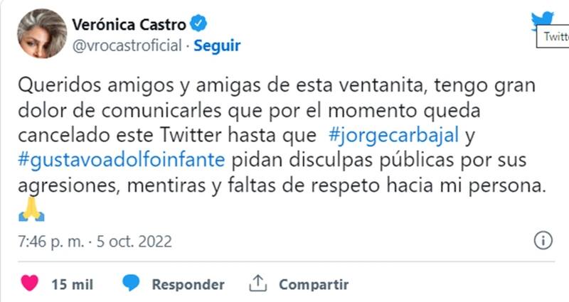 A través de su cuenta de Twitter, Verónica Castro lanzó un tuit asegurando que no regresará a la red social si no recibe disculpas de Gustavo Adolfo Infante y Jorge Carbajal.