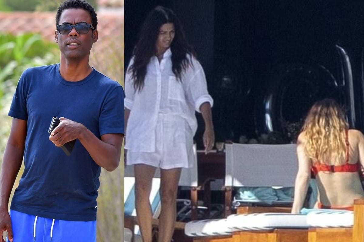 La publicación describe que Chris Rock viste una gorra, camisa oscura y pantalones cortos azules, mientras que Bell luce un bikini rojo con un sombrero. También se dice que la pareja está acompañada de Matthew McConaughey y Camila Alves.