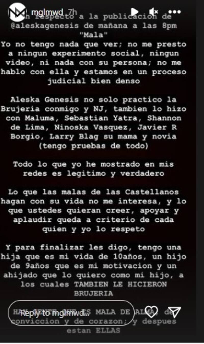 En un extenso mensajes, el hombre que ha sido sindicado como el responsable de la filtración del video que tiene como protagonista a la voz de "X" escribió: "Alexa no solo practicó la brujería conmigo y con Nicky Jam, también lo hizo con Maluma, Sebastián Yatra, Shannon de Lima, Ninoska Vásquez, Javier R. Borgio, Larry Blag, su mamá y novia".