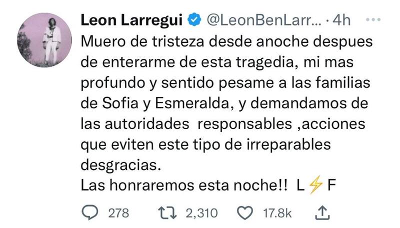 "Muero de tristeza desde anoche después de enterarme de esta tragedia, mi más profundo y sentido pésame a las familias de Sofia y Esmeralda, y demandamos de las autoridades responsables acciones que eviten este tipo de irreparables desgracias. ¡¡Las honraremos esta noche!! L / F", escribió Larregui en su red social.