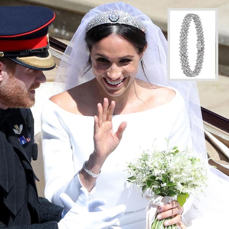 En la parte superior de la lista está el brazalete Cartier de 150 mil dólares de la duquesa de Sussex que usó el día de su boda con el Príncipe Harry en el Castillo de Windsor en 2018. La pulsera tiene 104 diamantes talla brillante y 52 diamantes talla baguette.\