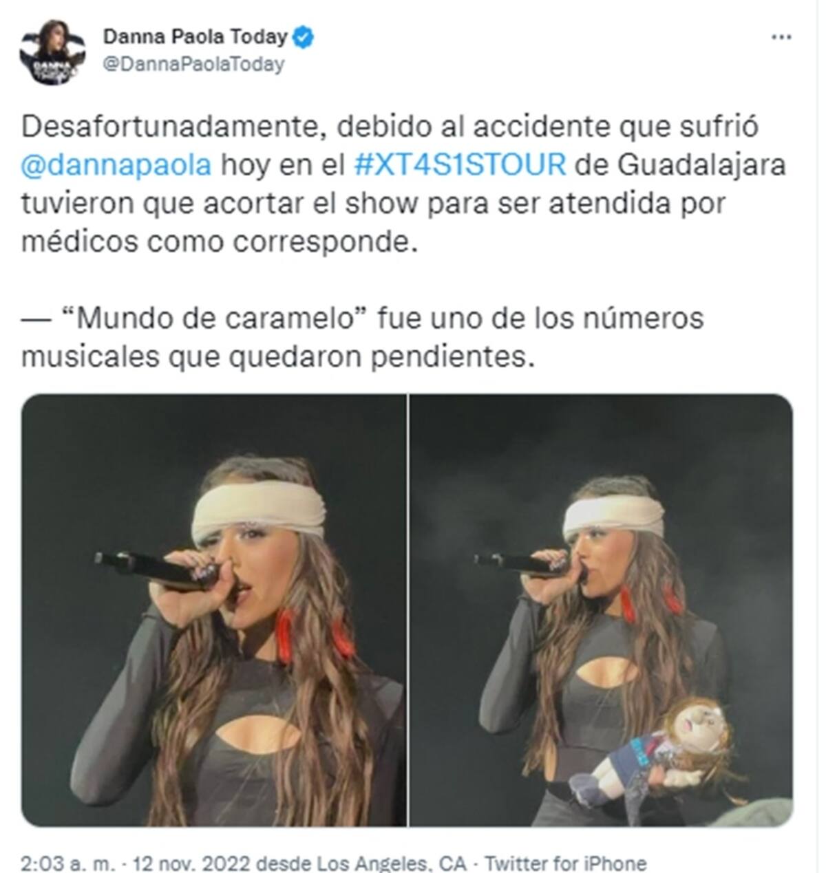 En un video grabado por un fan, Danna Paola le explicó a los asistentes al concierto que se golpeó con su rodilla y su ojo se inflamó: "Les voy a contar qué pasó. Cuando yo me hice hacia atrás creo que me pegué con mi rodilla y se me empieza a inflamar el ojo, dejé de ver, pero yo seguí y Emiliano me empezó a decir… y yo: 'Mier…, esto está gigante, tengo una bola', pero no importa, vamos a seguirle".