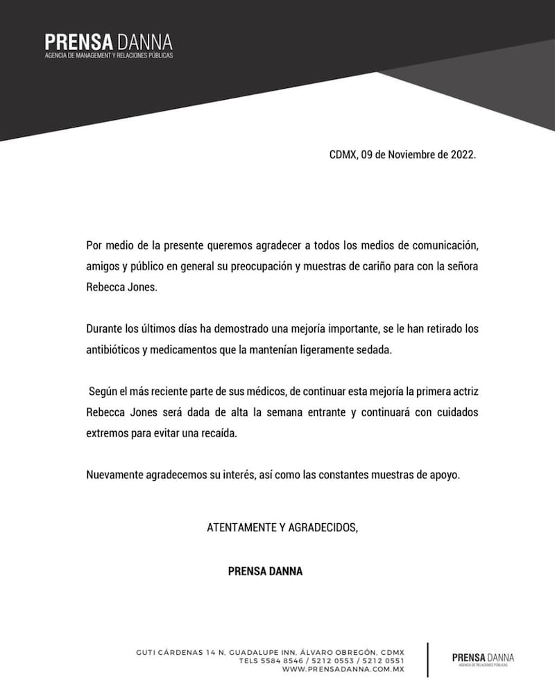De acuerdo con la información difundida por su gente de prensa, Rebecca Jones, quien ha estado hospitalizada varios días debido a una deficiencia pulmonar y una neumonía derivada de una infección, se encuentra estable y ya salió de terapia intensiva, La próxima semana podría ser dada de alta.