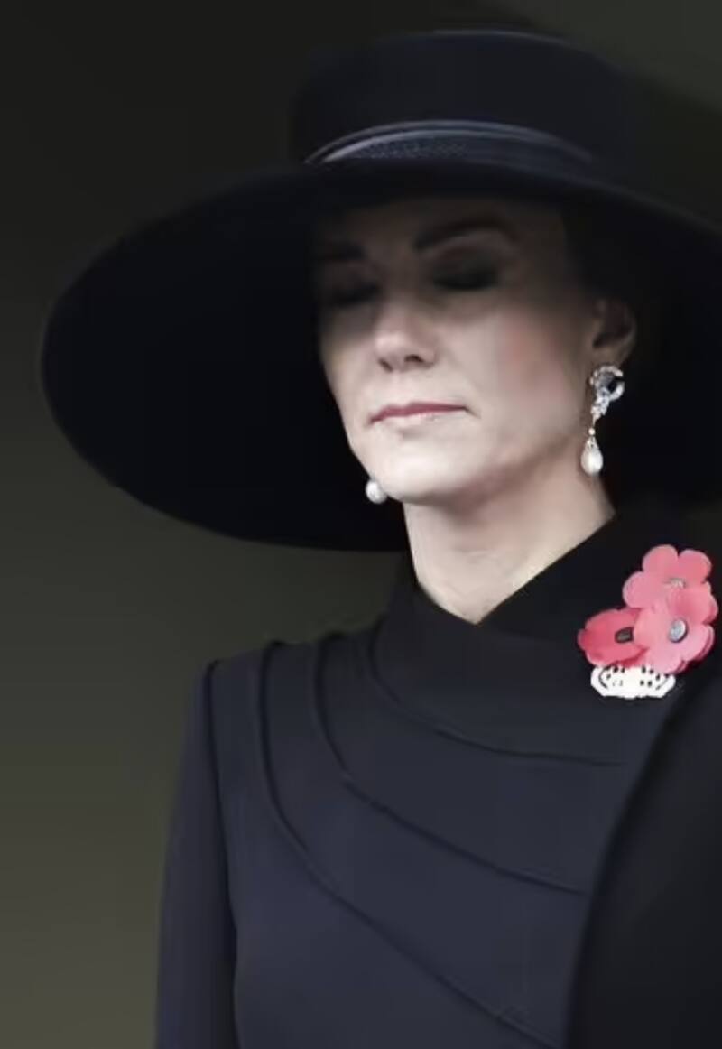 Para esta ocasión, Kate Middleton optó por un conjunto completamente negro, la tradicional amapola roja que utiliza la realeza durante noviembre para recordar a caídos, que completó con aretes llamativos. Tambiên llevaba  un sombrero negro alto de ala ancha de Philip Treacy.