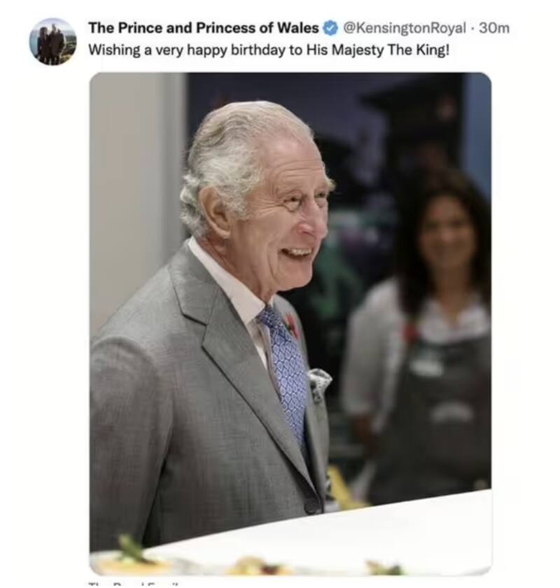 A través de su cuenta oficial de Twitter, , los príncipes de Gales, escribió: "¡Deseando un muy feliz cumpleaños a Su Majestad el Rey!".