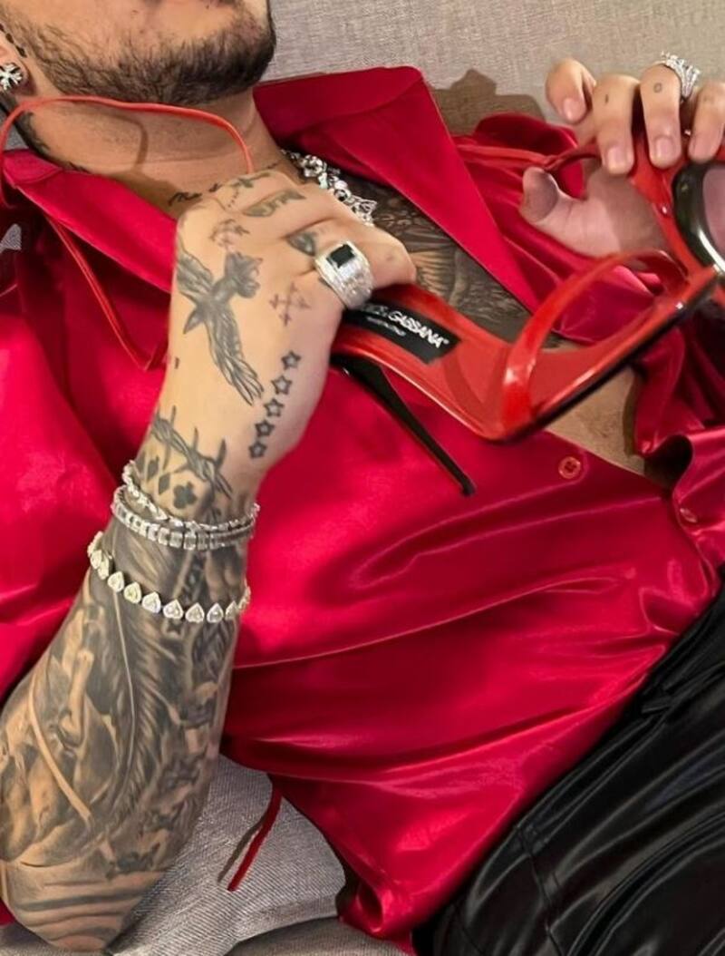 La siguiente instantánea muestra al intérprete de “Adiós amor” acostado solo en la cama, sosteniendo las zapatillas de la rapera en las manos.
