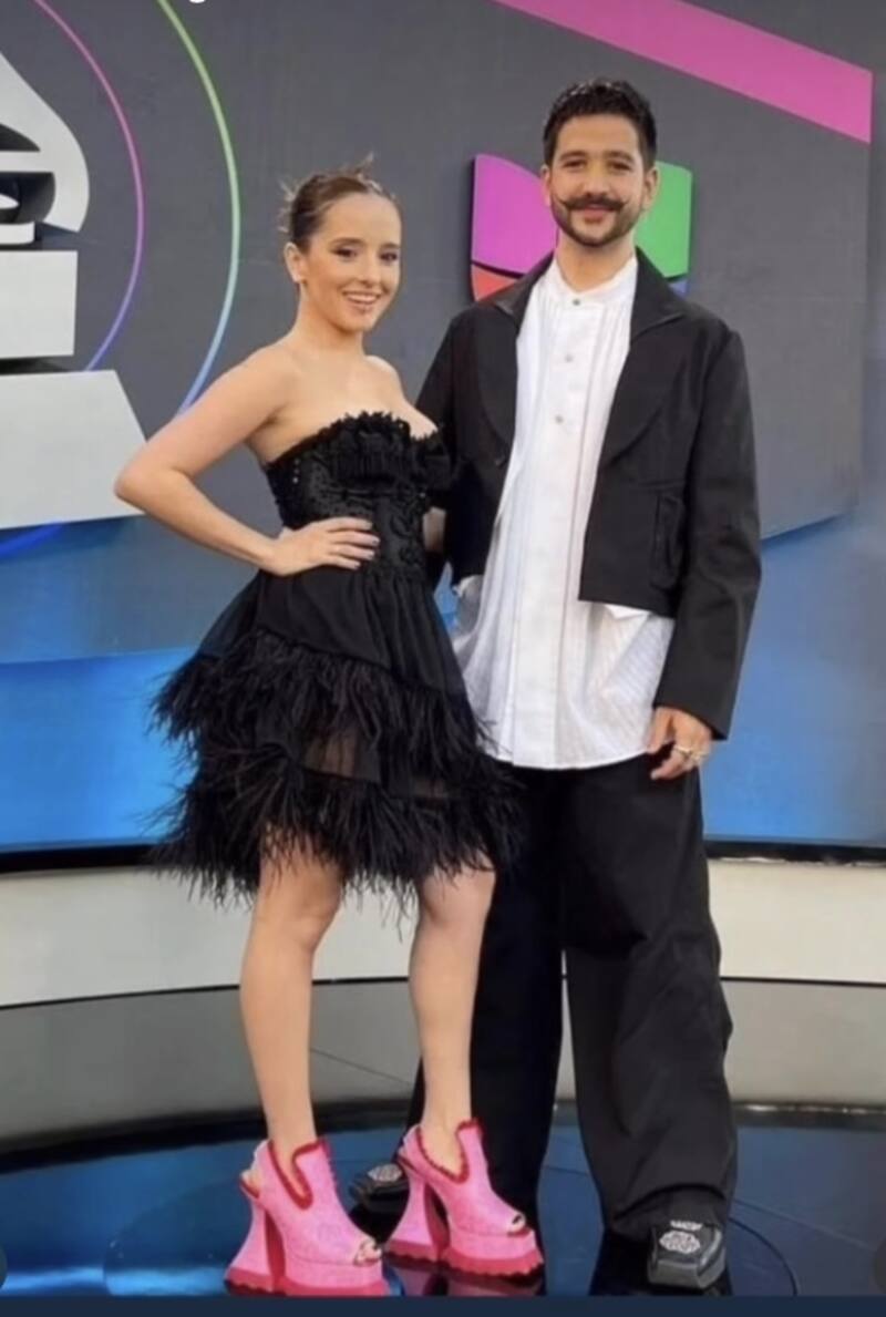 Lo que dejo de manifiesto que a los Montaner no hay quien iguale con su singular estilo, por ello Evaluna decidió darle su toque a su minivestido negro con corsé bordado y bajo con plumas a juego con unos zapatos peep toe de plataforma en color rosa con rojo que robaron las miradas.