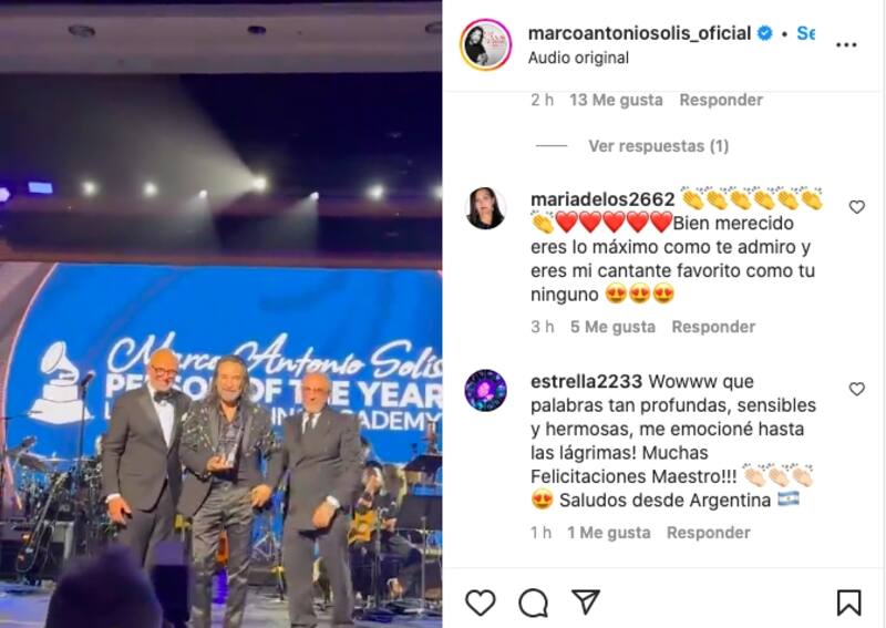 "No tengo palabras... tengo el corazón lleno de amor, el alma llena de vida y la boca repleta de agradecimientos y bendiciones para todos ustedes. Ser nombrado #PersonOfTheYear en el marco de los @latingrammys es un inmenso honor para este servidor". Con esas palabras, Marco Antonio Solís celebró en sus redes sociales el premio honorario que le entregó la Academia Latina de la Grabación, en la antesala de los Latin Grammy 2022 que se entregan este 17 de noviembre.