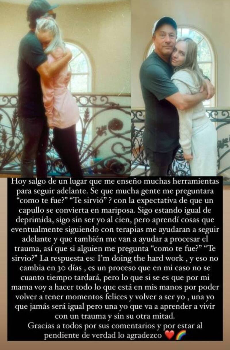 “Hoy salgo de un lugar que me enseñó muchas herramientas para seguir adelante. Sé que mucha gente me preguntará, ¿cómo te fue? ¿Te sirvió? Con la expectativa de que un capullo se convierta en mariposa. Sigo estando igual de deprimida, sigo sin ser yo al cien, pero aprendí cosas que eventualmente siguiendo con terapias me ayudarán a seguir adelante”, escribió.