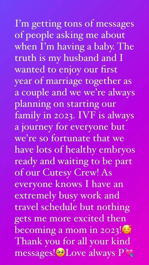 "Mi esposo y yo siempre quisimos disfrutar nuestro primer año de matrimonio juntos como pareja y siempre estamos planeando comenzar nuestra familia en 2023", aclaro.