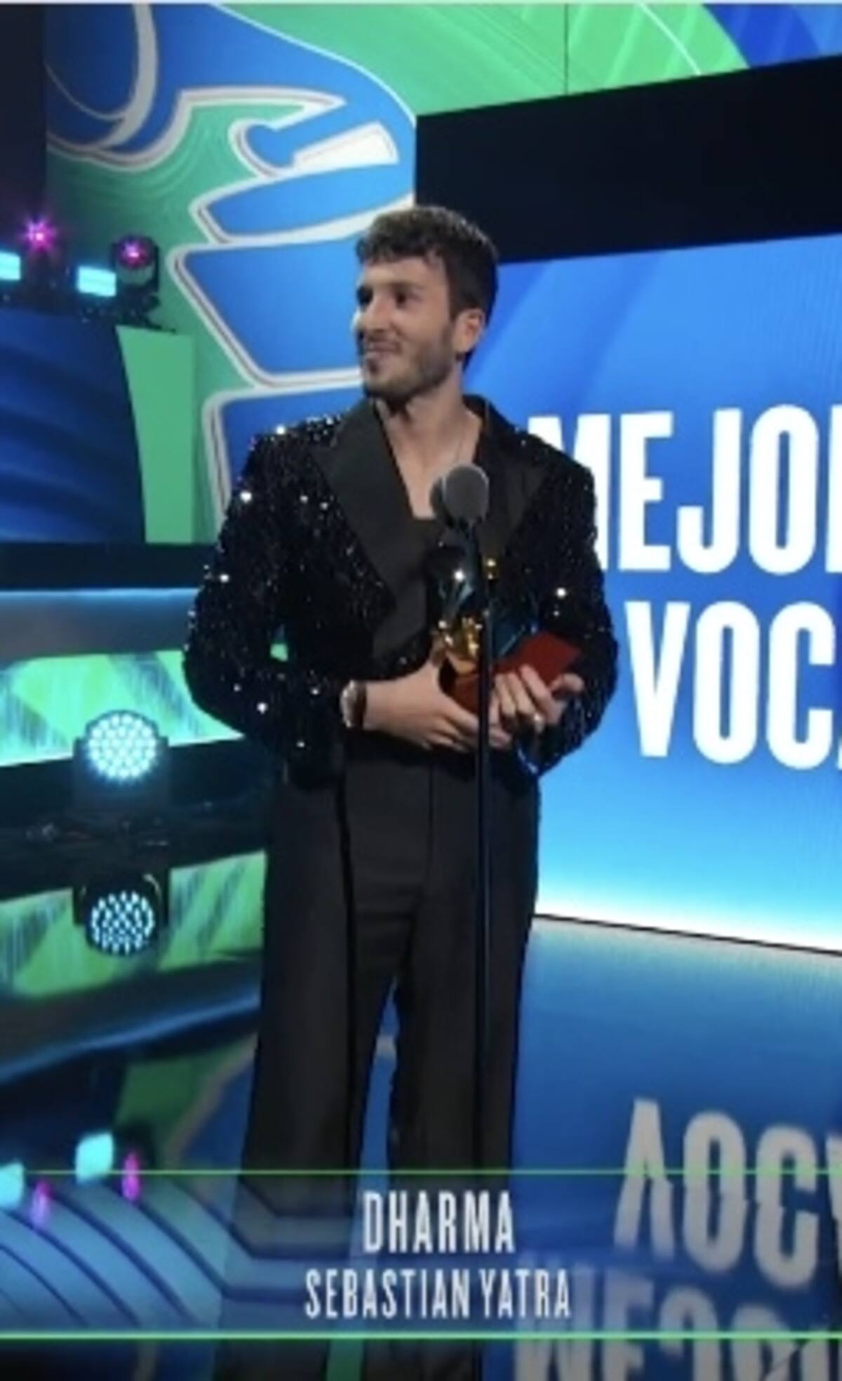 Más adelante en esa noche, con el mismo traje cruzado y bordado, recibió el premio a Mejor Álbum Vocal Pop del Año, gracias a su disco "Dharma", que lo ha llevado por una intensa gira mundial.