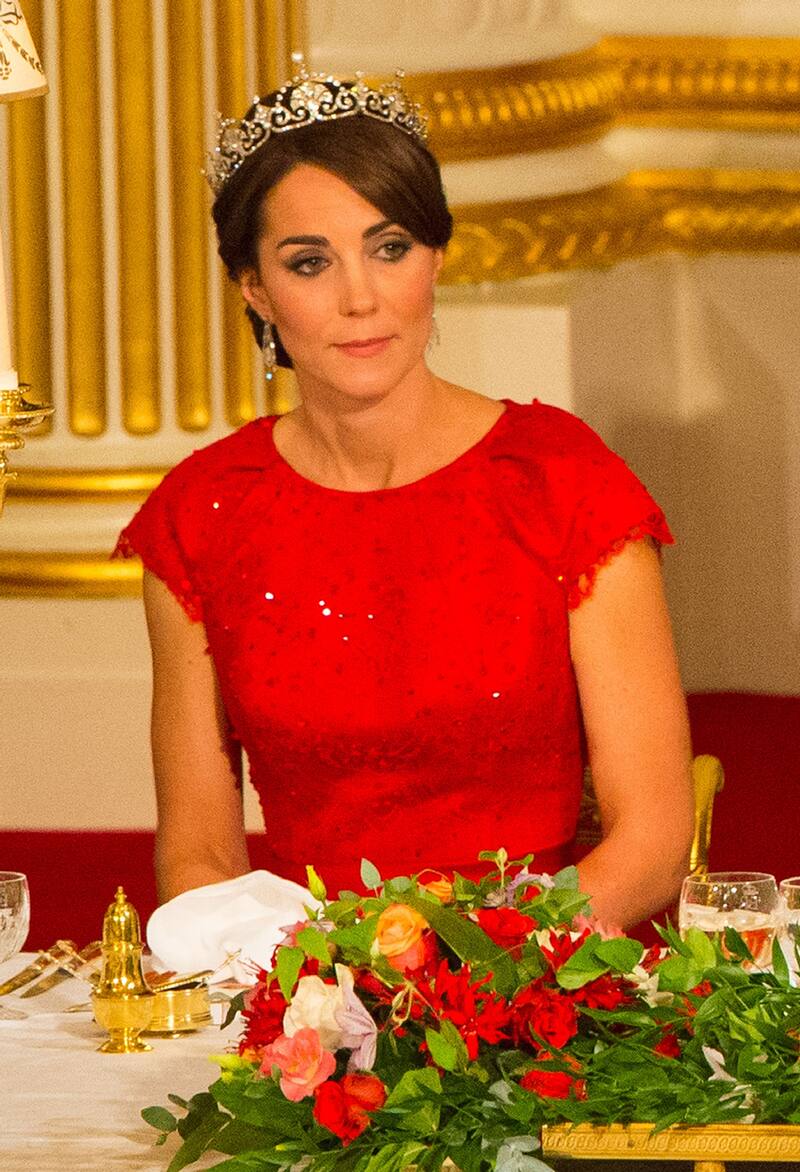 La segunda tiara que la princesa de Gales ha usado a menudo en visitas de estado es la tiara Cambridge Lover's Knot, una diadema amada por la difunta princesa Diana. Para los últimos ocho banquetes estatales desde 2015, Kate ha usado esta tiara.