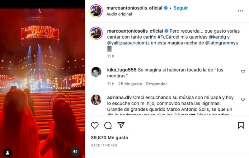 "Pero recuerda... que gusto verlas cantar con tanto cariño #TuCárcel mis queridas @karolg y @yalitzaapariciomtz en esta mágica noche de @latingrammys", escribió en el mensaje con el que acompañó el video.