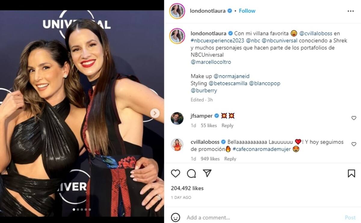 Uno que Laura Londoño celebró en su cuenta de Instagram, donde publicó una foto junto a Carmen Villalobos con el siguiente mensaje: "Con mi villana favorita @cvillaloboss en #nbcuexperience2023 @nbc @nbcuniversal conociendo a Shrek y muchos personajes que hacen parte de los portafolios de NBCUniversal".
