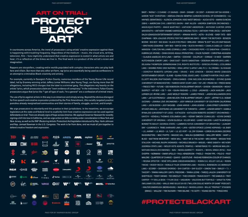 "Art on Trial: Protect Black Art" es una carta abierta que respaldan docenas de músicos, ejecutivos de la industria de la música, expertos legales y más. Esta carta defiende la expresión creativa y protesta por el uso de letras de rap como medio para criminalizar a los artistas negros.